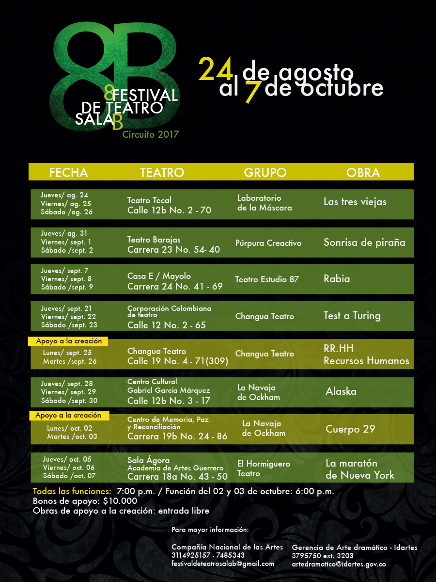 Festival de Teatro Sala B. Llega a su octava versión y esta vez llega con dos estrenos, seis obras creadas y 22 funciones, las cuales estarán en cartelera hasta el ocho de octubre en diferentes espacios de la cuidad.