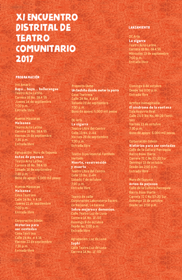 XI Encuentro Distrital de Teatro Comunitario. El público podrá disfrutar gratuitamente de un circuito de obras de gran sentido social que llegan para inquietar a todos los públicos.