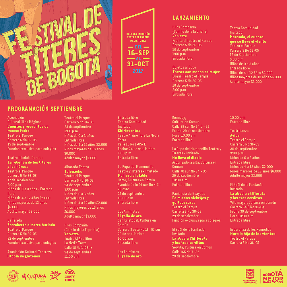 Festival de Títeres de Bogotá. Empieza el 16 de septiembre y siempre se convierte en un fiesta llena de magia para los niños, especialmente, pero que también disfrutan los adultos.