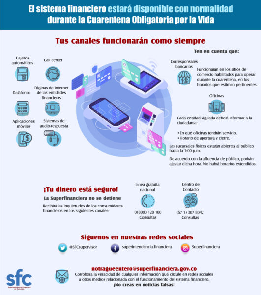 Así lo determinó la Superintendencia Financiera, la cual estableció que todos los consumidores financieros podrán acceder a sus recursos como lo hacen habitualmente mediante el uso de páginas web, aplicaciones móviles, call center, sistemas de audio respuesta y demás mecanismos de acceso virtual y digital de las entidades vigiladas.