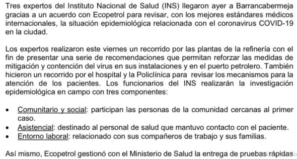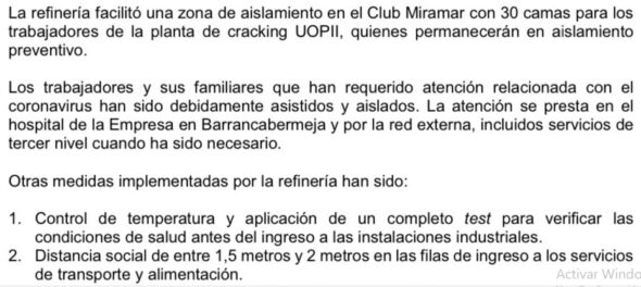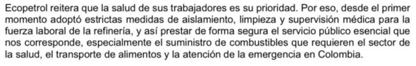 –La Empresa Colombiana de Petroleos, Ecopetro, informó que reforzó las medidas de prevención y aislamiento para contener el Covid-19 en la Refineria de Barrancabermeja, Santander, tras la muerte de uno de sus trabajadores por causa del virus.