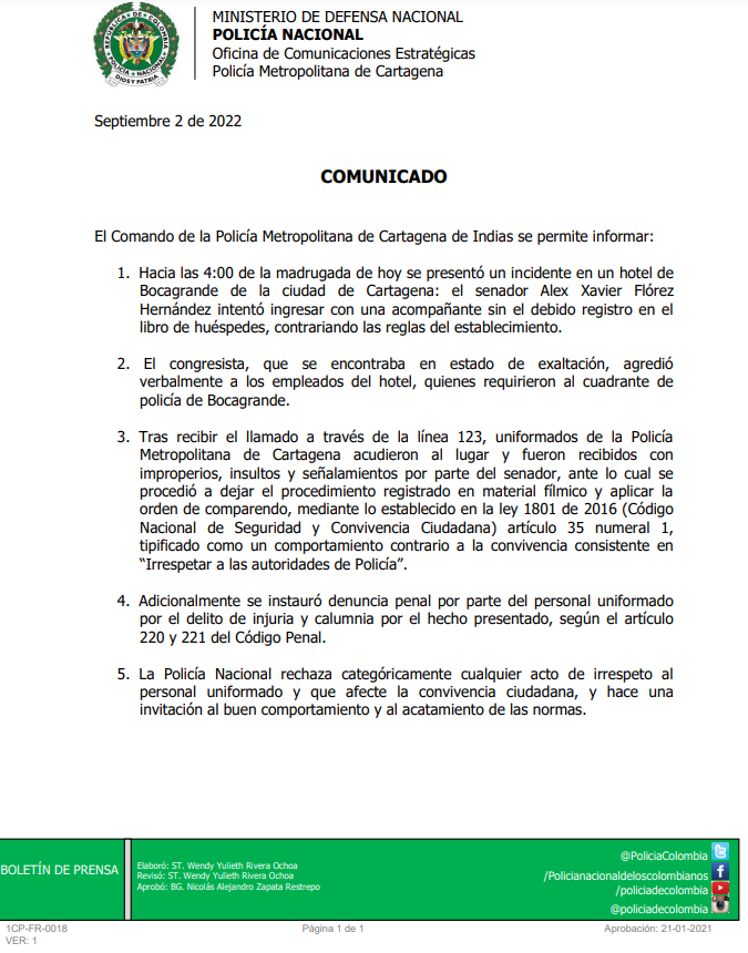 El comando de la Policía de Cartagena indicó que le impuso un comparendo y entabló una denuncia penal contra el senador por injuria y calumnia por los improperios y señalamientos que hizo y por el irrespeto a la autoridad.