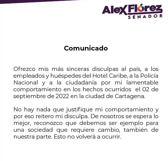 –El senador del Pacto Histórico, Alex Flórez Hernández, quien la madrugada de este viernes protagonizó un bochornoso incidente en estado de embriaguez en la ciudad de Cartagena, se disculpó y prometió: «Esto no volverá a ocurrir».