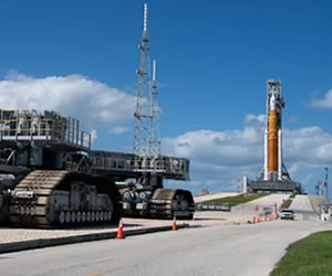 El cohete será transportado sobre una enorme plataforma rodando muy lentamente, para evitar en lo posible las vibraciones que puedan dañarlo.