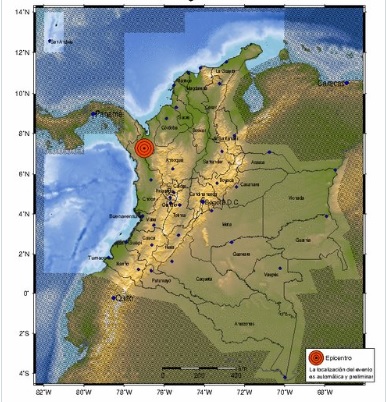 El primer movimiento telúrico, de mayor magnitud, se registró a las 2:08:47 A.M., con epicentro en el Océano Pacífico, frente a la costa del Chocó, al noroccidente del país.