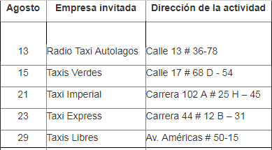 Durante el mes de agosto, las emisoras El Sol, Radio Uno y La Cariñosa, en las franjas musicales y de noticias, invitarán a los oyentes a que feliciten y manifiesten vía WhatsApp el buen servicio que les prestó un conductor de taxi, notificando el nombre y el número de placa del vehículo. Estos conductores serán invitados especiales al Gran Concierto de música popular, con la presentación de artistas de Radio Uno y El Sol Bogotá, para que los conductores de taxi compartan el domingo con su familia y amigos. Este concierto se realizará como cierre de la celebración del mes del taxista en Bogotá.