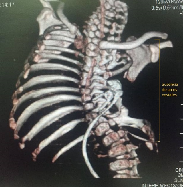 En su caso particular se evidenció la ausencia de sus costillas del lado izquierdo y de los músculos de la pared torácica, que le ocasionaban dificultad respiratoria severa.