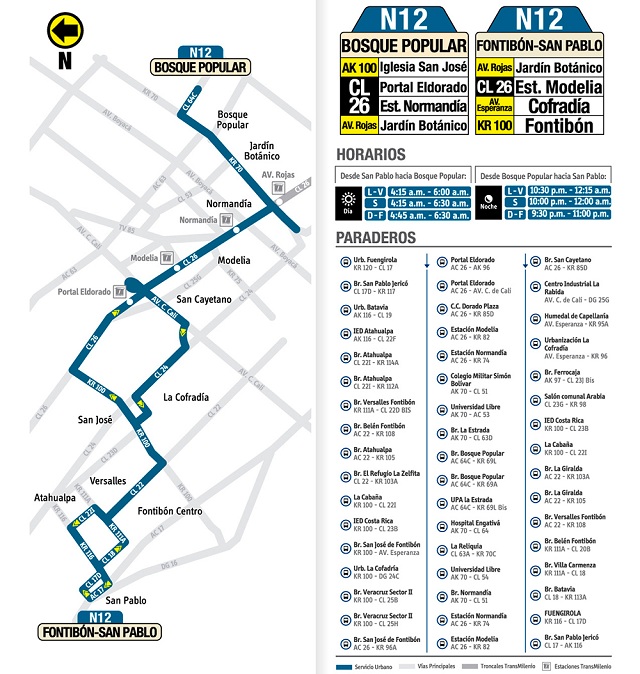 Si usted está en el Bosque Popular y se dirige a Fontibón San Pablo, la ruta perfecta es la N12, su recorrido principal es por la Calle 26 y su operación está divida en la mañana y noche, en el caso de ir de San Pablo a Bosque Popular el horario es: