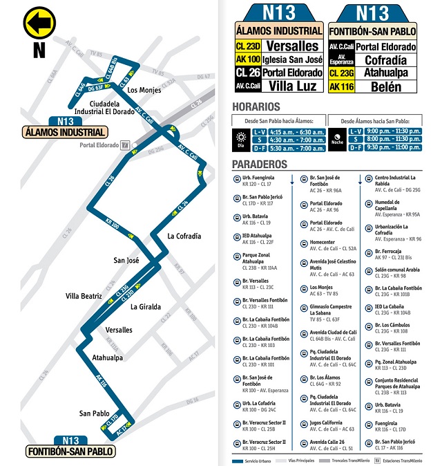Con la ruta N14 Engativá Centro-Fontibón San Pablo y desde San Pablo hacia Engativá Centro en el día, el recorrido tiene el siguiente horario