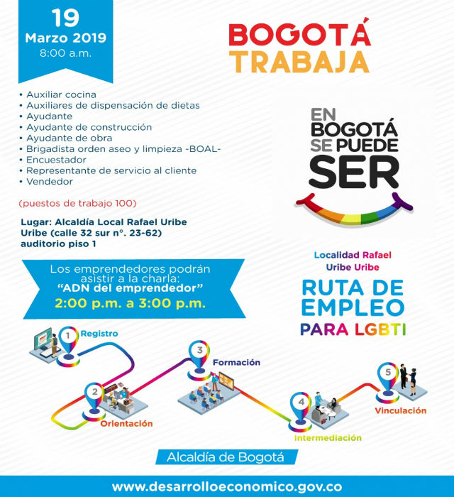 La Alcaldía de Bogotá invita a los ciudadanos que se encuentran en búsqueda de oportunidades laborales a participar en la Ruta de Empleo LGTBI que se realizará este martes 19 de marzo en la Alcaldía Local Rafael Uribe Uribe (Calle 32 Sur # 23-62), a partir de las 8:00 de la mañana.