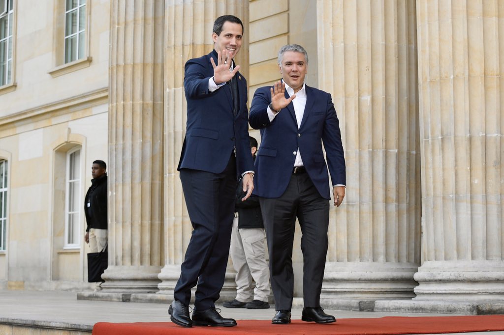 –El Presidente Ivan Duque recibió este domingo al Presidente Interino de Venezuela, Juan Guaido, con alfombra roja y con todos los honores militares de jefe de Estado, para reafirmar su apoyo al mandatario y su rechazo al «usurpador» Nicolás Maduro.