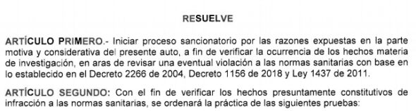 En este sentido, reportó el organismo, se dio inicio a las actuaciones administrativas sancionatorias en el marco de las competencias legales de la entidad, para investigar los hechos que presuntamente infringen las disposiciones legales sanitarias vigentes.