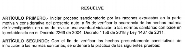 En este sentido, reportó el organismo, se dio inicio a las actuaciones administrativas sancionatorias en el marco de las competencias legales de la entidad, para investigar los hechos que presuntamente infringen las disposiciones legales sanitarias vigentes.