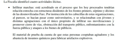 –Por petición de la Fiscalía, un juez de control de garantías envió a la cárcel Modelo de la capital a 6 sujetos acusados de reclutar jóvenes para realizar actos vandálicos en jornadas de protesta en Bogotá.
