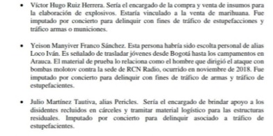 En las diligencias un fiscal de la Dirección Especializada contra las Organizaciones Criminales imputó a los capturados los delitos de concierto para delinquir, en concurso con terrorismo, homicidio, tráfico de estupefacientes y porte ilegal de armas y municiones.