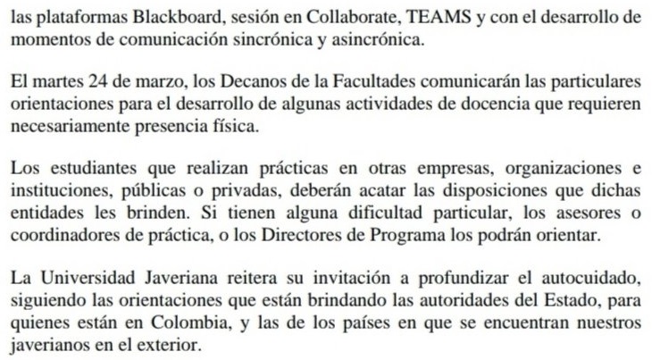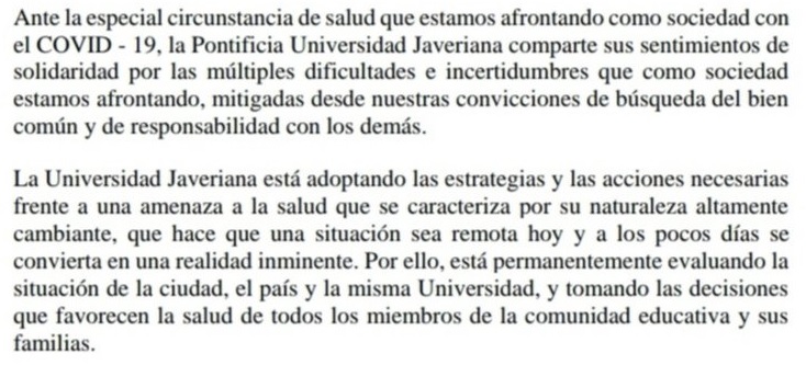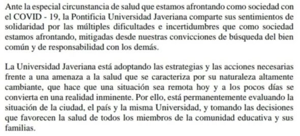 La Universidad Javeriana en el comunicado informó que partir de la fecha se ha tomado la decisión de suspender las actividades académicas de docencia en sus programas de pregrado, posgrado y educación continua hasta el 21 de marzo. El 24 de marzo, se reiniciarán las actividades de docencia en forma remota o virtual.