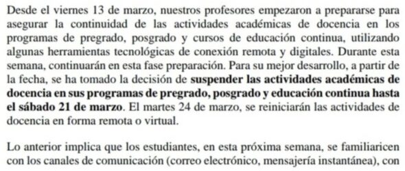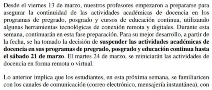 Somos conscientes del esfuerzo que representa estar tanto tiempo confinado en un espacio, especialmente para nuestros estudiantes. Es un deber asumir con responsabilidad el trabajo en casa, evitando el uso de transporte público masivo y disminuyendo la posibilidad de convertirnos en fuente de diseminación de la enfermedad. Requerimos del apoyo y la solidaridad de toda la comunidad para que, unidos ante esta causa común, podamos superar esta eventualidad mundial.