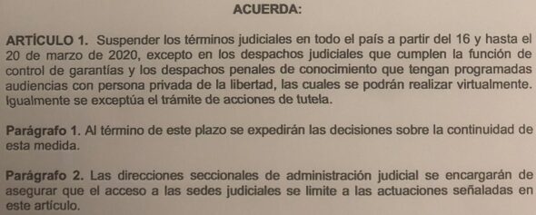 –Atendiendo a la necesidad de proteger a los jueces, magistrados, empleados y usuarios, el Consejo Superior de la Judicatura tomó desde la decisión de suspender, inicialmente, hasta el 20 de marzo los términos judiciales.