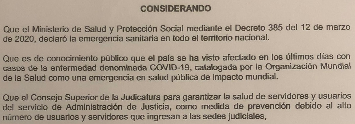 –Atendiendo a la necesidad de proteger a los jueces, magistrados, empleados y usuarios, el Consejo Superior de la Judicatura tomó desde la decisión de suspender, inicialmente, hasta el 20 de marzo los términos judiciales.