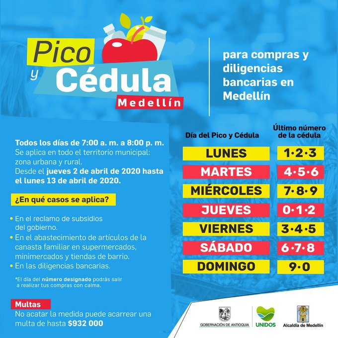 “Hemos pasado a la etapa de la mitigación; eso quiere decir que es necesario aumentar las medidas con el objetivo de enfrentar al coronavirus, por eso hemos tomado la decisión de implementar la medida de pico y cédula para abastecerse, para ir a bancos o para reclamar subsidios”, explicó el alcalde Daniel Quintero.