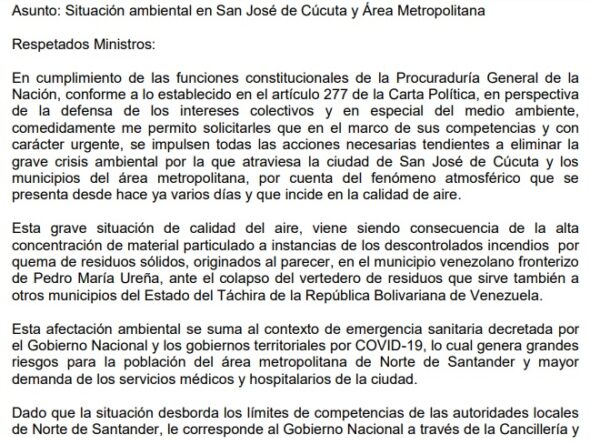 En carta a los ministros Claudia Blum y Ricardo Lozano, el Procurador precisó que “esta afectación ambiental se suma al contexto de emergencia sanitaria decretada por el Gobierno Nacional y los gobiernos territoriales por COVID-19, lo cual genera grandes riesgos para la población del área metropolitana de Norte de Santander y mayor demanda de los servicios médicos y hospitalarios de la ciudad”..