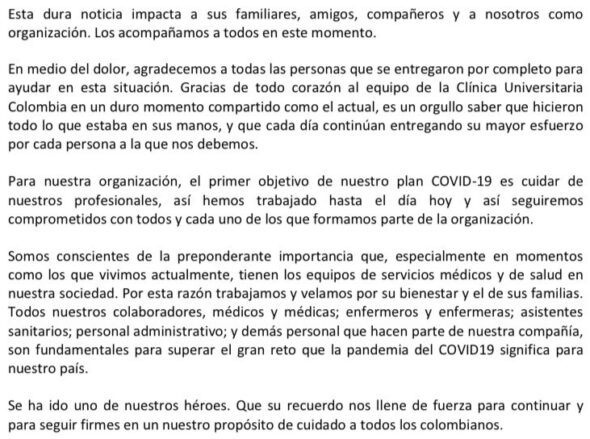 «Lamentamos el fallecimiento por COVID-19 de un médico de urgencias de la Clínica Universitaria Colombia. Su memoria perdurará, con enorme gratitud, en todas las vidas que contribuyó a salvar a lo largo carrera. Nuestra solidaridad con sus familiares y allegados en estos momentos», escribió Minsalud en su cuenta en twitter.