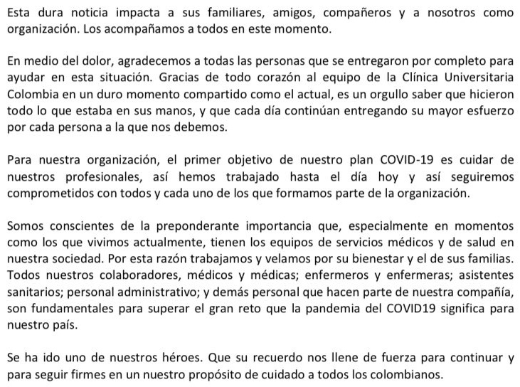 «Lamentamos el fallecimiento por COVID-19 de un médico de urgencias de la Clínica Universitaria Colombia. Su memoria perdurará, con enorme gratitud, en todas las vidas que contribuyó a salvar a lo largo carrera. Nuestra solidaridad con sus familiares y allegados en estos momentos», escribió Minsalud en su cuenta en twitter.