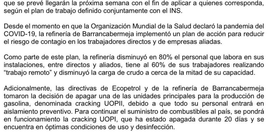 –La Empresa Colombiana de Petroleos, Ecopetro, informó que reforzó las medidas de prevención y aislamiento para contener el Covid-19 en la Refineria de Barrancabermeja, Santander, tras la muerte de uno de sus trabajadores por causa del virus.