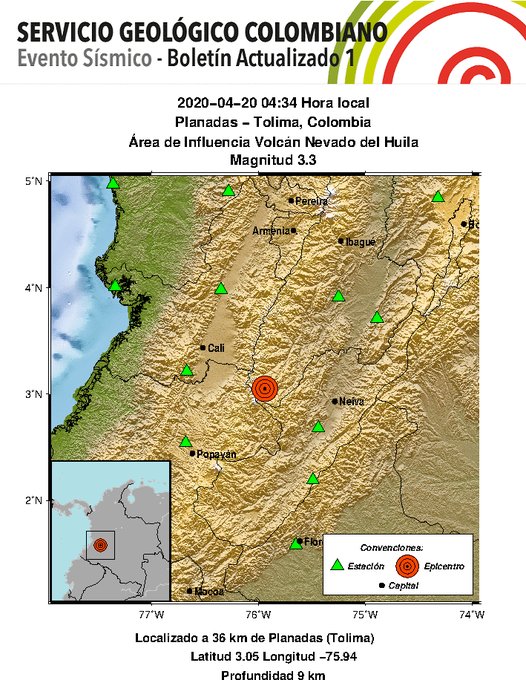 El sismo se registró a 37 kilómetros del casco urbano del municipio de Planadas, a una profundidad de 8 kilómetros y se sintió en varios municipios tolimenses, lo mismo que en el departamento del Cauca, más concretamente en los poblados de Corinto y Miranda, ubicados a 30 y 39 kilómetros de distancia del Volcán Nevado del Huila.