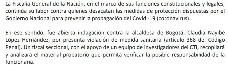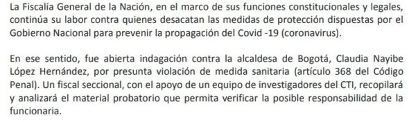 La Fiscalía abrió indagación penal contra la alcaldesa Claudia López por violar la cuarentena