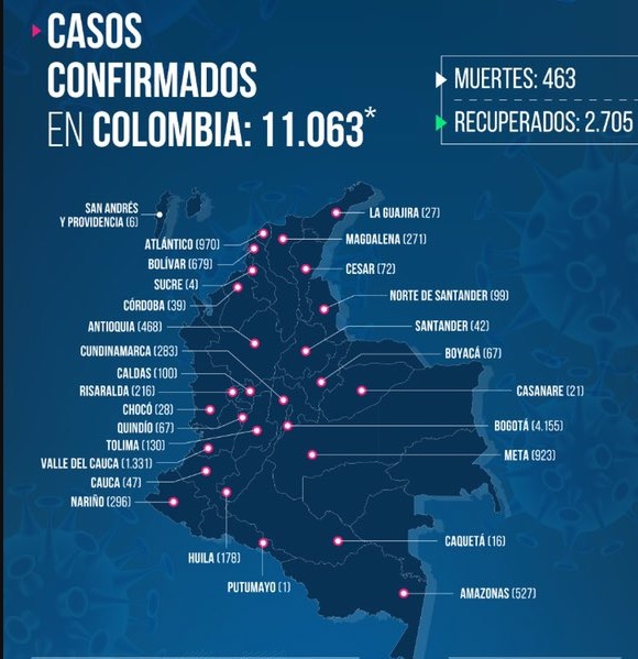 Los 568 casos nuevos de contagio se localizaron así: Bogotá (127), Amazonas (94), Cartagena (92), Barranquilla (37) , Nariño (34), Huila (31), Tolima (27), Atlántico (26), Meta (25), La Guajira (12), Valle (11), Córdoba (8), Boyacá (6), Bolívar (5), Cauca (5), Norte de Santander (5), Cundinamarca (5), Magdalena (5), Santa Marta (3), Sucre (2), Antioquia (2), Chocó (1), Putumayo (1), Caquetá (1), Quindío (1), Cesar (1) y Casanare (1).