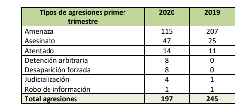 Agrega que esta forma de violencia, que ha tenido un aumento del 88% en relación con el mismo período del 2019, no es una casualidad, por el contrario, genera alerta después de la alta cifra de amenazas que se registró el año anterior, lo que podría indicar que estas se están concretando a través del asesinato.
