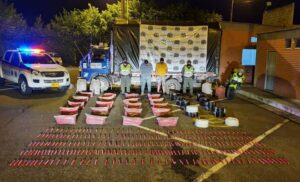 En la requisa, se hallaron 2 mil 800 barras de explosivos “Indugel” y 18 rollos de cordón detonante equivalentes a 9 mil metros, que iban a ser entregados a las bandas criminales del «clan del golfo» y «los caparros», que delinquen en el Bajo Cauca antioqueño.
