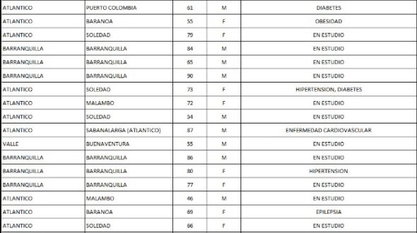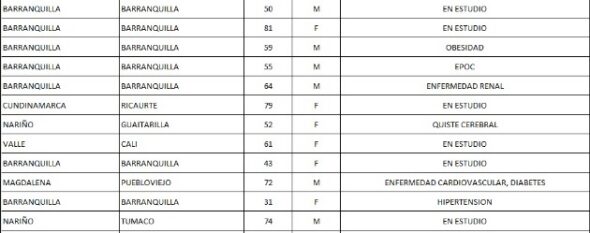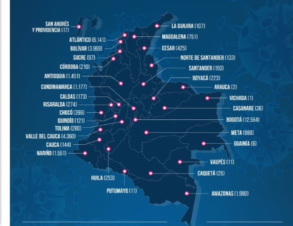 Los nuevos casos se presentaron en: Bogotá (376), Barranquilla (192), Valle (154), Atlántico (139), Nariño (120), Cartagena (99), Antioquia (91), Cundinamarca (39), La Guajira (35), Amazonas (26), Santander (19), Sucre (16), Córdoba (15), Santa Marta (14), Bolívar (12), Cesar (11), Caldas (9), Cauca (9), Risaralda (6), Magdalena (2), Boyacá (2), Tolima (1), Caquetá (1), Chocó (1), Atlántico (1), Meta (1), Quindío (1).