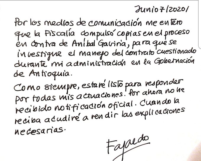 «Respecto al proceso del Gobernador Gaviria, manifiesto mi entera disposición de atender el llamado de las autoridades competentes frente a mis actuaciones como Gobernador de Antioquia, siempre ajustadas a la ley».