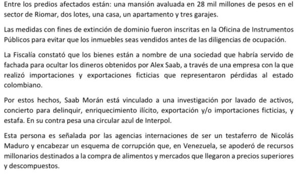 –La Fiscalía impuso medidas cautelares con fines de extinción de dominio a bienes del empresario Álex Saab, quien es señalado de ser testaferro de Nicolás Maduro. Entre las propiedades figura una mansión, un apartamento y dos lotes, avaluadas en 35 mil millones de pesos.