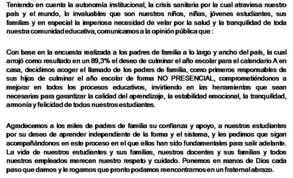 En un comunicado, la agremiación estableció que la decisión se tomó teniendo en cuenta «una encuesta realizada a los padres de familia a lo largo y ancho del país».