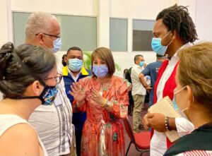 La Ministra del Interior, también se reunió con líderes comunales y representantes de las comunidades negras, afrocolombianas, raizales y palenqueras de la heroica, a quienes invitó a fortalecer sus liderazgos, a capacitarse y a presentar sus proyectos de emprendimiento, de desarrollo organizativo y cultural ante el Ministerio del Interior.