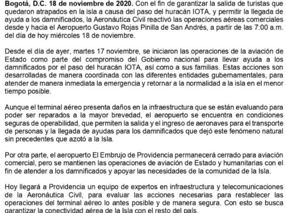 Las operaciones del aeropuerto internacional de San Andrés se suspendieron en la madrugada del 16 de noviembre «para preteger a los viajeros y al personal de la terminal, teniendo en cuenta las difíciles comndiciones meteorológicas originadas por el huracán Iota», subraya.