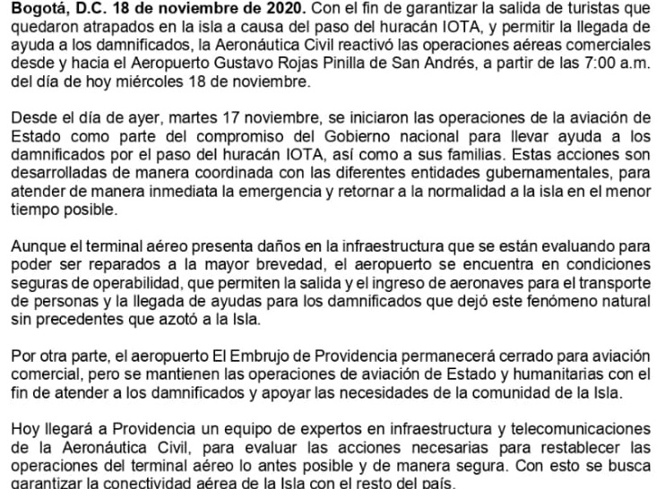En cuanto al aeropuerto El Embrujo de la isla de Providencia, la Aerocivil notifica que continuará cerrado para operaciones comerciales y solo se permiten las operaciones de aviación de Estado y Humanitarias con el fin de atender a los damnificados y apoyar las necesidades de sus habitantes.
