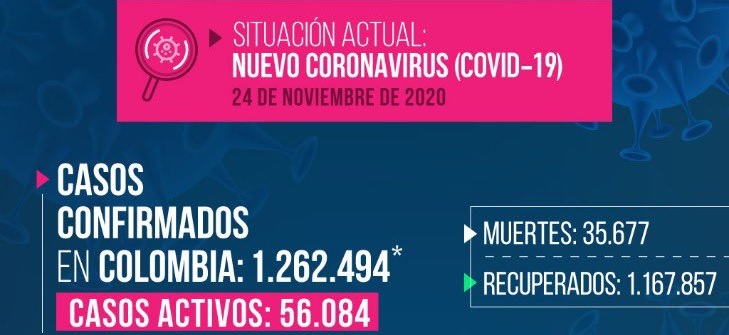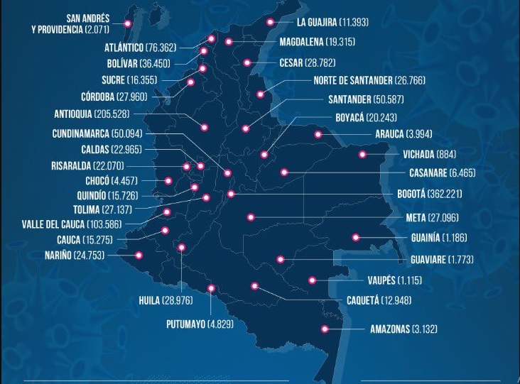 –El Ministerio de Salud de Colombia reportó este martes que aumentaron a un millón 262 mil 494 los contagios de Covid-19 en el territorio colombiano, mientras que los muertos llegaron a 35 mil 677.