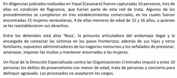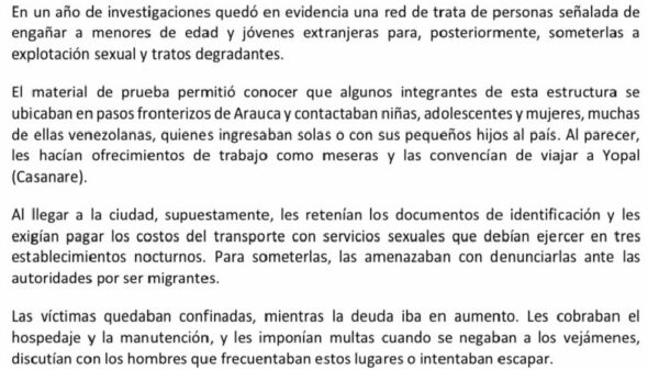 Las víctimas al parecer eran contactadas en pasos fronterizos de Arauca con ofrecimientos de trabajo como meseras en Yopal, la capital del departamento de Casanare. Allí, supuestamente, les exigían pagar los costos del transporte con servicios sexuales que debían ejercer en tres establecimientos nocturnos.