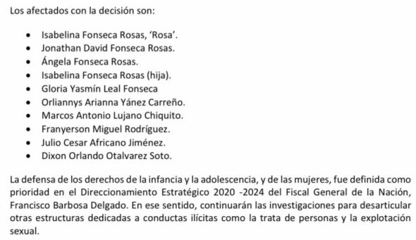 Según la Fiscalía, las técnicas investigativas desplegadas, el trabajo de agentes encubiertos y el testimonio de tres mujeres, dos de ellas de 15 y 16 años rescatadas en febrero de este año, permitieron documentar cada una de las actividades ilícitas y capturar a los responsables.