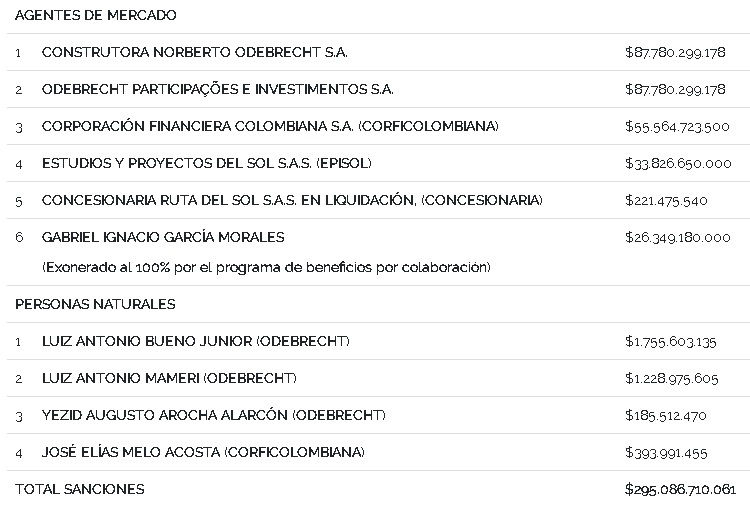 En su informe, la Superintendencia de Industria y Comercio, señala que en su rol de Autoridad Única de Competencia, sancionó a: CONSTRUTORA NORBERTO ODEBRECHT S.A.; ODEBRECHT PARTICIPAÇÕES E INVESTIMENTOS S.A. (conjuntamente ODEBRECHT); CORPORACIÓN FINANCIERA COLOMBIANA S.A. (CORFICOLOMBIANA); ESTUDIOS Y PROYECTOS DEL SOL S.A.S. (EPISOL); CONCESIONARIA RUTA DEL SOL S.A.S. EN LIQUIDACIÓN (CONCESIONARIA) y GABRIEL IGNACIO GARCÍA MORALES, por idear y ejecutar un sistema restrictivo de la libre competencia durante la adjudicación y ejecución del contrato “RUTA DEL SOL TRAMO 2” .