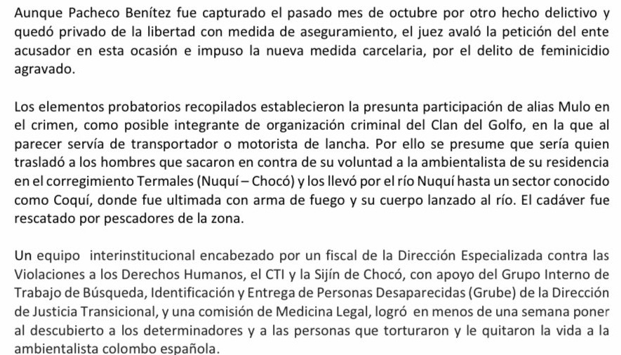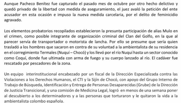 El sujeto en señalado de haber transportado a los hombres que sacaron contra su voluntad a la ambientalista de su residencia en el corregimiento Termales y los llevó por el río Nuquí hasta un sector conocido como Coquí, donde fue ultimada con arma de fuego y su cuerpo lanzado al río.