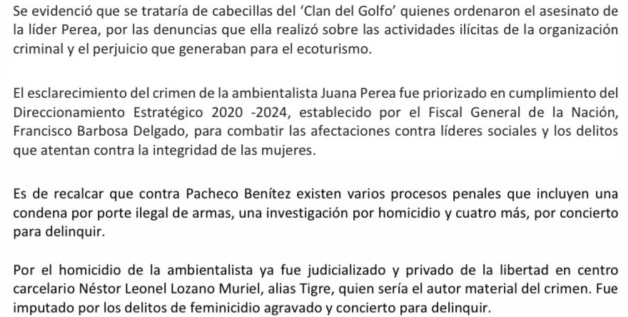 Juana Perea – Foto Twitter–La Fiscalía obtuvo medida de aseguramiento en centro carcelario contra Aristides Pacheco Benitez, alias «Mulo», supuesto integrante del llamado ‘clan del golfo’, por su presunta participación en el asesinato de la ambientalista Juana Perea, ocurrido el 29 de octubre de 2020, en Nuquí, departamento del Chocó