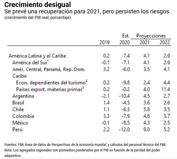 –No obstante definir como sinuoso el camino hacia la recuperación en América Latina y el Caribe, por los graves efectos causados por la pandemia del Covid-19, el Fondo Monetario revisó al alza el crecimiento para este año de Colombia, Brasil, México, Chile y Perú, pero a la baja la región del Caribe debido a que la reanudación del turismo ha tardado mucho más de lo previsto.