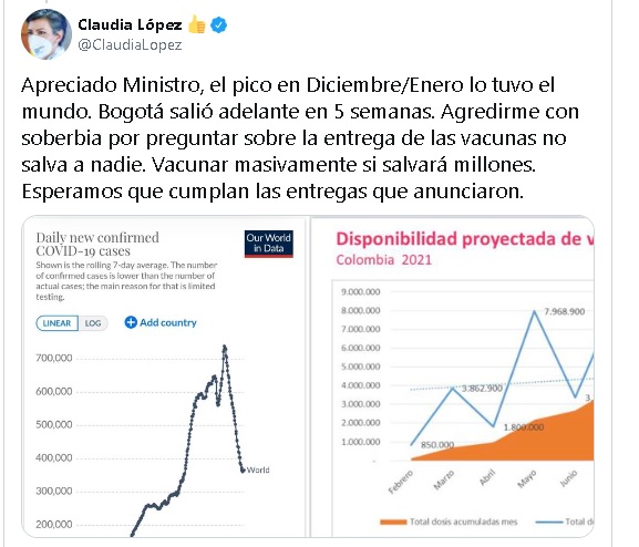 –“Termina otro día sin que distribuyan las vacunas Sinovac que llegaron desde el sábado”, escribió en su cuenta en Twitter la alcaldesa de Bogotá, Claudia López, en un enérgico reclamo al Ministro de Salud, Fernando Ruiz Gómez.
