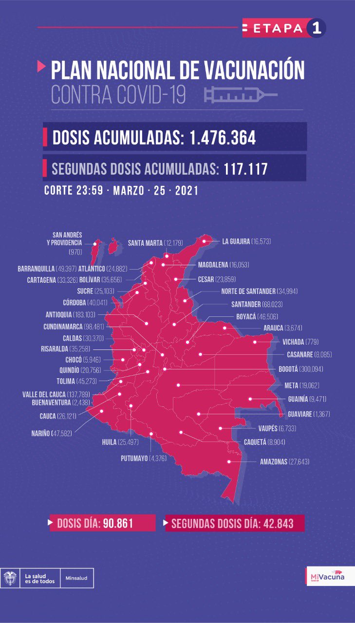 Según el reporte del Ministerio de Salud, este jueves se completaron 1 millón 476 mil 364 dosis administradas, con las 90 mil 981 aplicadas durante este día en el territorio colombiano, tanto a adultos mayores de 80 y 70 años, como al personal de primera línea del sistema de salud.