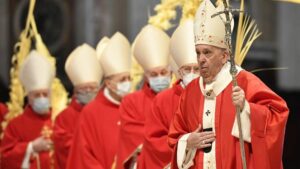 Su amor se acerca a nuestra fragilidad, llega hasta donde nosotros sentimos más vergüenza. Y ahora sabemos que no estamos solos. Dios está con nosotros en cada herida, en cada miedo. Ningún mal, ningún pecado tiene la última palabra. Dios vence, pero la palma de la victoria pasa por el madero de la cruz. Por eso las palmas y la cruz están juntas.